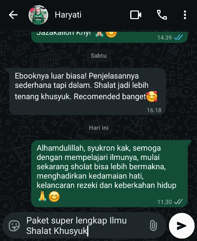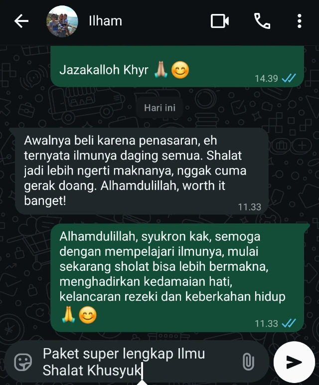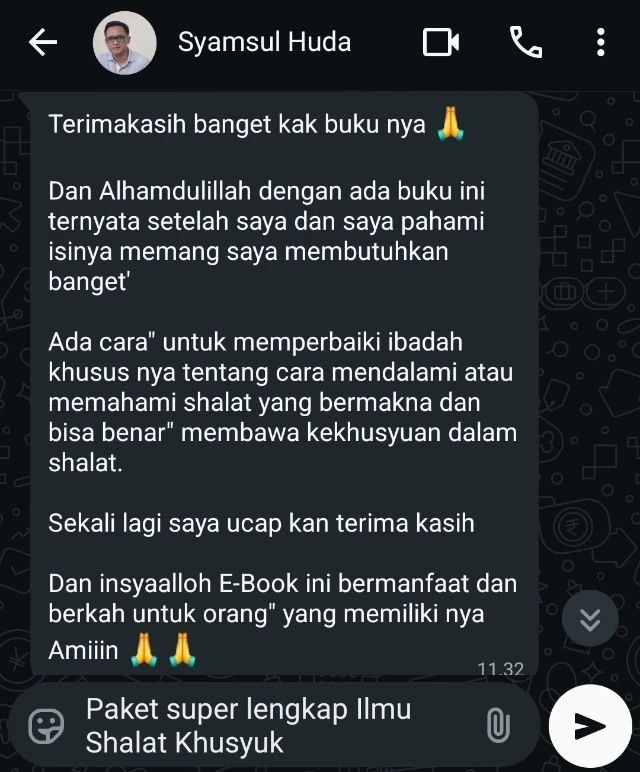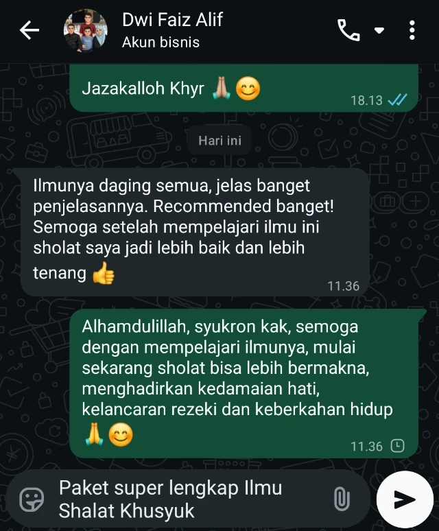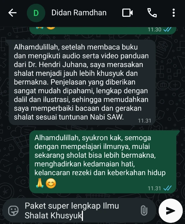 “Saya percaya, shalat bukan hanya kewajiban, tapi juga kunci ketenangan jiwa, kesehatan tubuh, dan keberkahan hidup. Karena itu, paket ini saya susun agar bisa menjadi jalan bagi siapa pun yang ingin meraih kekhusyuan dalam shalat.”